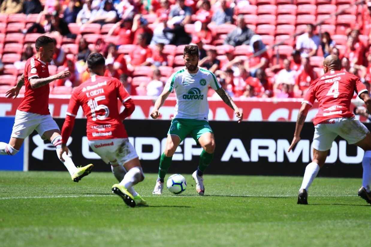A Chapecoense segue ladeira abaixo. Hoje perdeu para o Internacional em Porto Alegre em um jogo cheio de revisões de gols. O Inter, após a terceira chance, comemorou a vitória de 1 a 0. A Chape pode assumir a lanterna nesta segunda caso o Avaí vença o Atlético-MG.