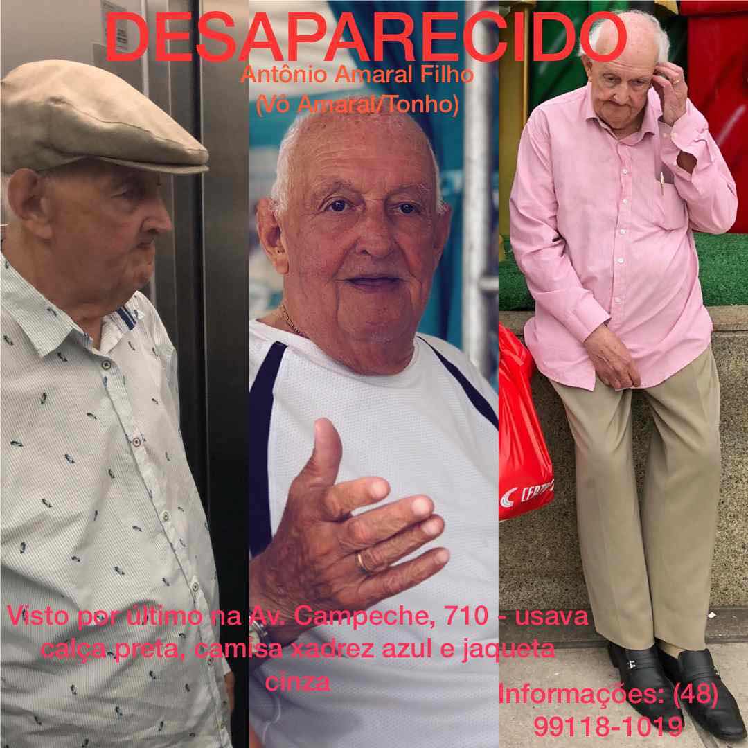 Está desaparecido desde sábado Antonio Amaral Filho, o Seu Amaral. Ele foi visto pela última vez no Campeche, no Sul da Ilha, quando saiu pra caminhar por volta das 15 horas. Seu Amaral mora na Agronômica e tem 84 anos. Por muitos anos residiu em Curitiba. Informações sobre ele podem ser repassadas no contato direto da família: 991181019.
